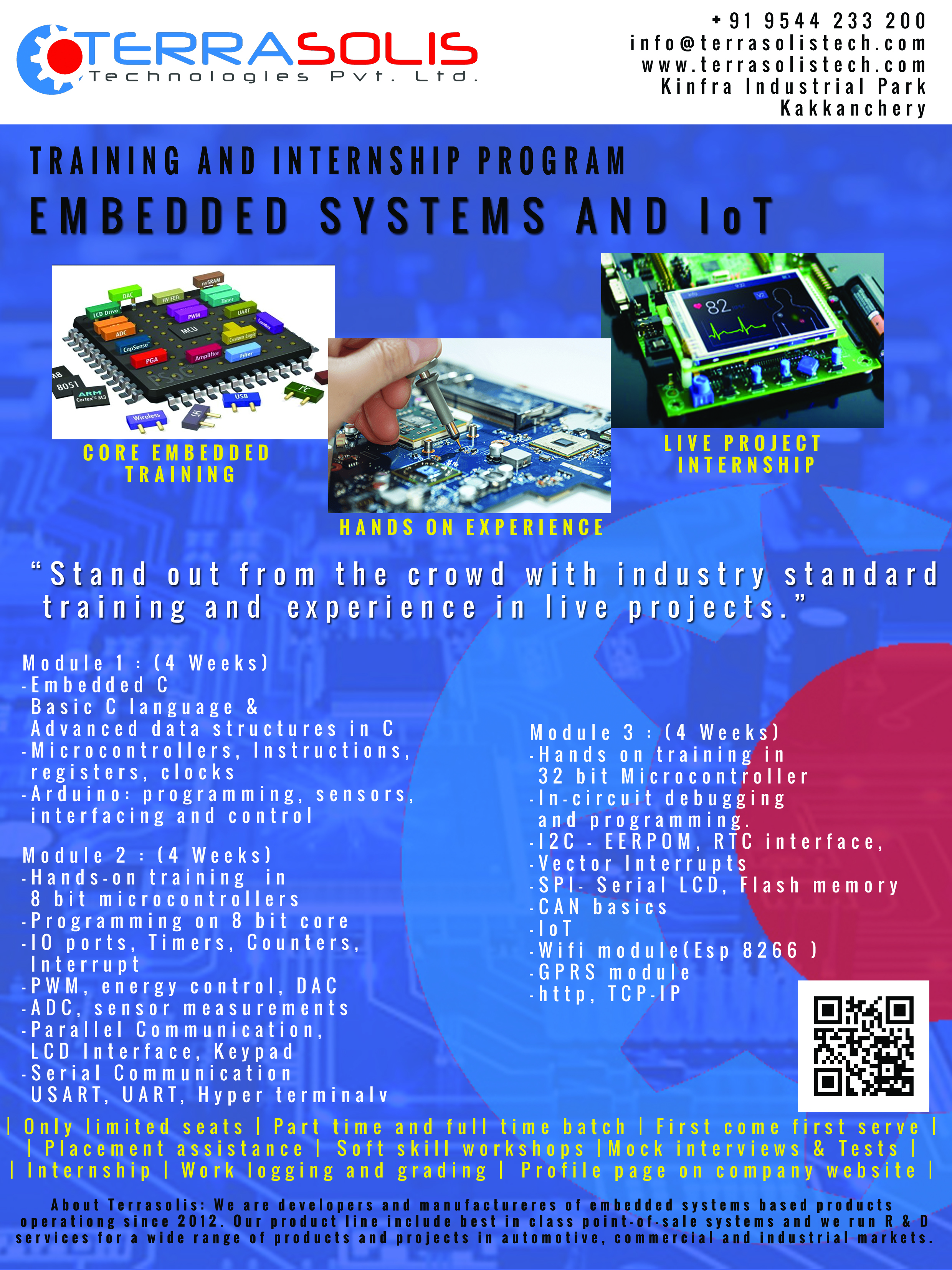 BrochureAt Terrasolis we provide the trainees an extensive training in embeeded systems and IoT. Our trainers are experienced professional in the field and take you to an in-depth learning path. For every theory and concept you learn we back it up with equal hours of lab an practical implementation, so that your knowledge is solidly based on implementation rather than learning. We have theory classes and labs setup for the same. Once successfully completed the training of 12 weeks, you will be subjected to a test and evaluation based on which candidates will be selected for internships on our live projects.